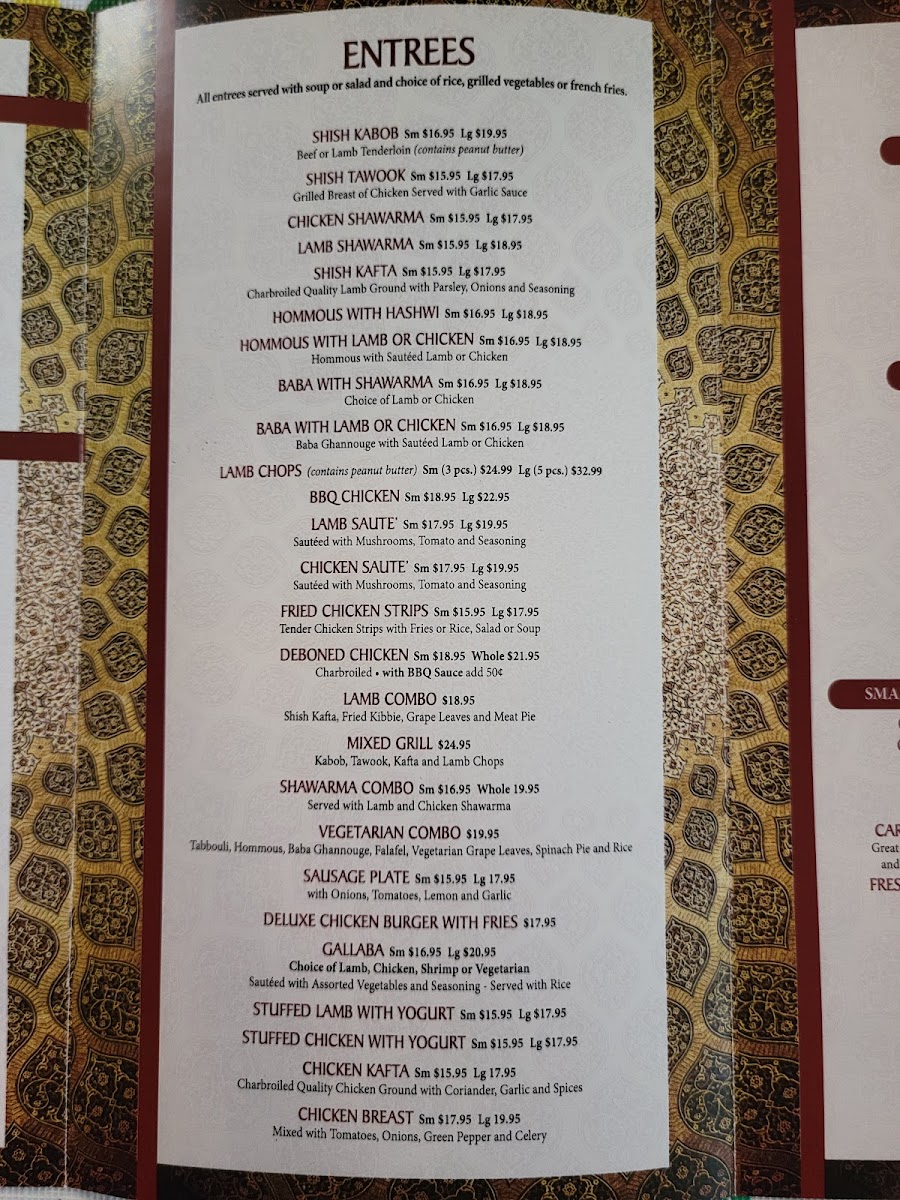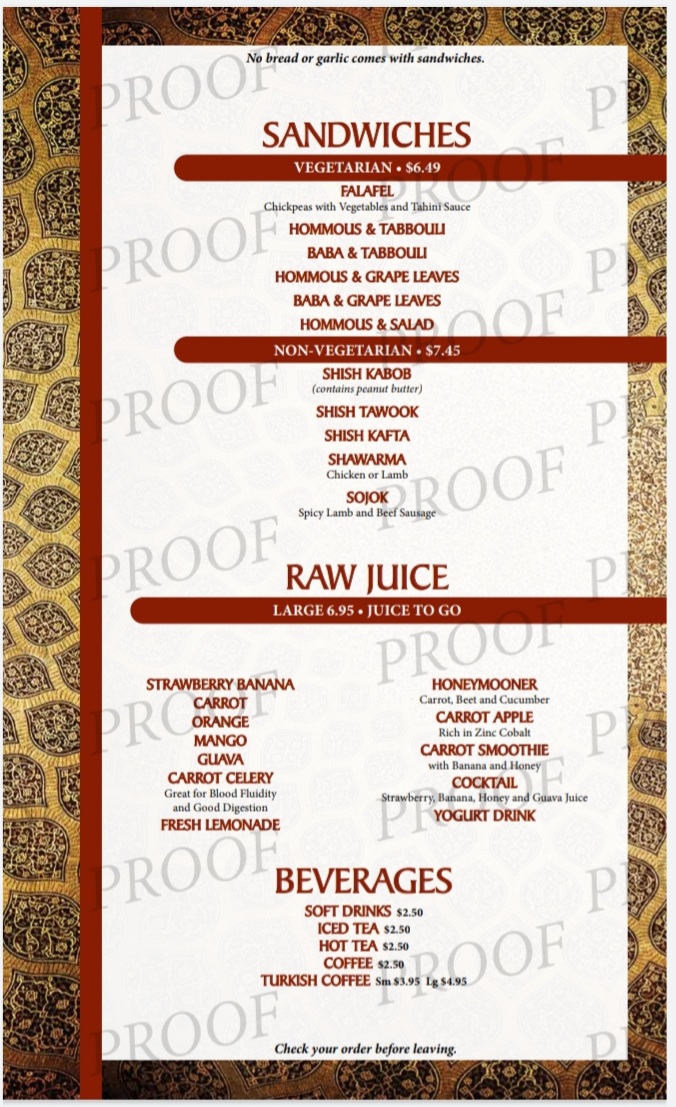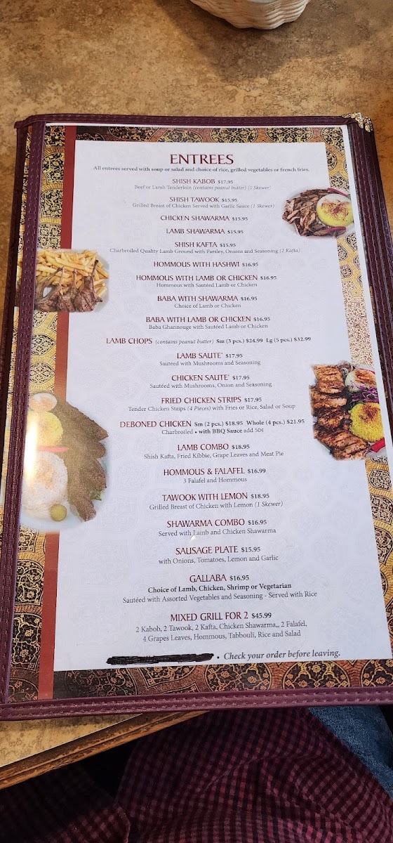 The menu features an impressive array of dishes that celebrate traditional flavors. The Mixed Grill for Two is a must-try, presenting a sumptuous collection of kabobs, tawook, and falafel, accompanied by hommous and tabbouli for just $45.99. For lighter bites, try the Falafel Sandwich or the savory Hummus and Lamb, both priced at $6.49 and $16.95 respectively.